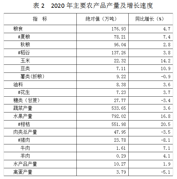 全年粮食作物播种面积33.73万公顷,比上年增长2.2%;经济作物播种面积36.86万公顷,增长2.1%。粮食总产量176.93万吨,增长4.7%。水果总产量792.02万吨,比上年增长16.8%,其中,柑橘类水果551.98万吨;增长20.5%;柿子产量108.75万吨,增长10.5%;梨产量29.09万吨,增长10.8 %;葡萄产量为42.29万吨,增长6.6%。蔬菜产量533.65万吨,比上年增长3.6%。
