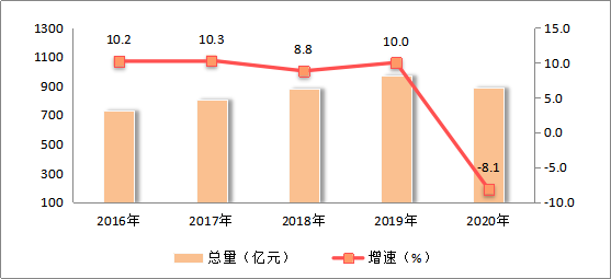 2020年,全市实现社会消费品零售总额888.91亿元,比上年下降8.1%。按经营单位所在地分,2020年,城镇社会消费品零售额723.84亿元,下降9.1%;乡村社会消费品零售额165.07亿元,下降3.5%。