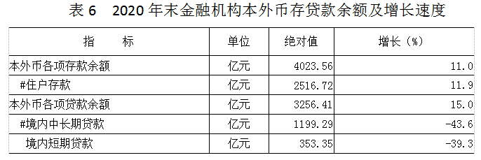 年末金融机构本外币存款余额4023.56亿元,增长11.0%。其中人民币各项存款余额3995.53亿元,增长10.9%,本外币贷款余额3256.41亿元,增长15.0%。其中人民币各项贷款余额3254.58亿元,增长15.0%。