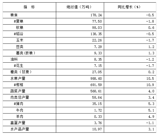全市粮食播种面积34.06万公顷,粮食总产量178.24万吨。全年水果产量988.60万吨,比上年增长10.5%,其中,柑橘类水果增长10.9%,柿子增长6.2%,葡萄增长10.2%。全市蔬菜种植面积356.51万亩,蔬菜(含食用菌)产量587.06万吨,比上年增长4.4%。中草药种植面积75.95万亩,同比增长74.2%。全年生猪出栏455.24万头,比上年增长6.7%。期末存栏293.49万头,比上年增长2.9%。家禽出栏1.35亿只,下降1.4%。禽蛋产量3.76万吨,下降1.1%。