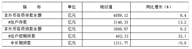 年末金融机构本外币存款余额4859.12亿元,比上年增长8.4%,其中,人民币各项存款余额4816.41亿元,增长8.2%。本外币贷款余额3869.57亿元,增长9.2%,其中,人民币各项贷款余额3866.62亿元,增长9.2%。