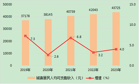 图8 2019- 2023年城镇居民人均可支配收入及增长速度