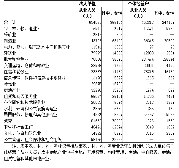 在第二产业和第三产业法人单位从业人员中,位居前三位的行业是:制造业148798人,占17.4%;教育101680人,占11.9%;公共管理、社会保障和社会组织98186人,占11.5%。在个体经营户从业人员中,位居前三位的行业是:批发和零售业237474人,占51.3%;住宿和餐饮业78216人,占16.9%;制造业36315 人,占7.8%(详见表2-3)。