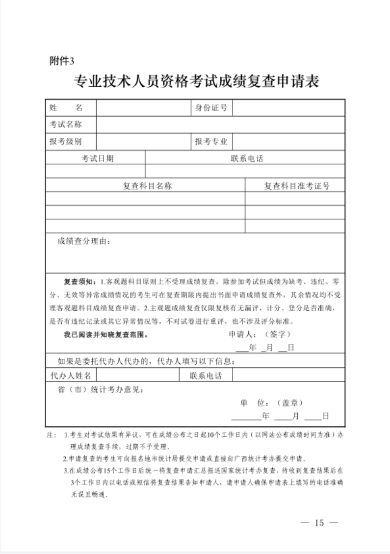 (四)成绩复查。有需要复查成绩的考生请于成绩公布15个工作日内向报名地市统计局提交复查申请,逾期无效。复查申请表见附件3。